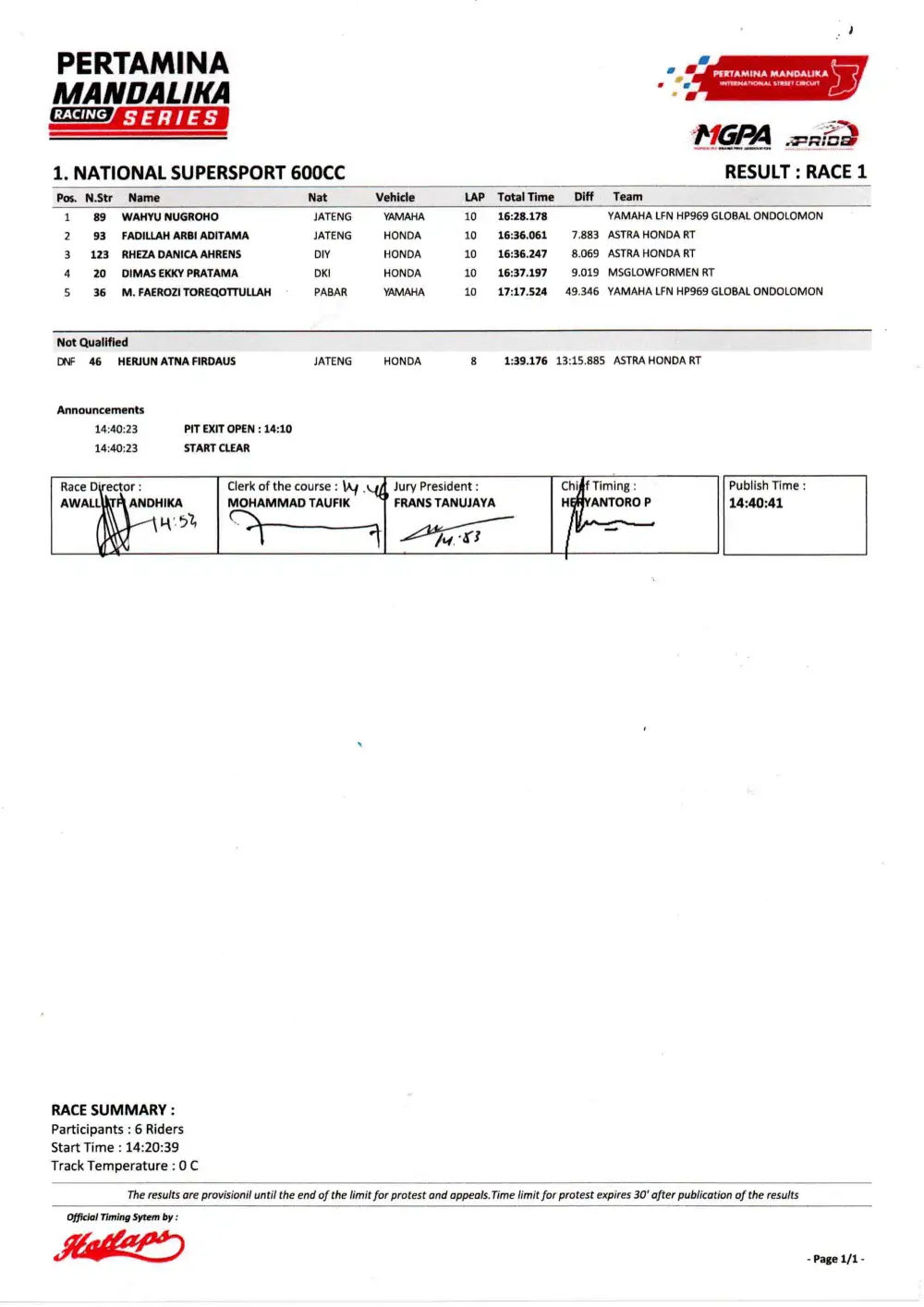 Berikut hasil lomba race 1 yang tersaji dalam slide sebagai berikut: