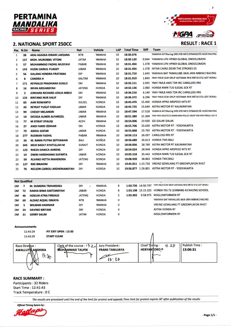Di kelas National Sport 250, Arai Agaska berhasil memenangkan duel ketat melawan Murobbil Vitoni dengan selisih waktu hanya 0,044 detik. Balapan ini menjadi sorotan karena ketatnya persaingan sejak awal, disertai insiden tabrakan yang melibatkan beberapa pembalap ternama.