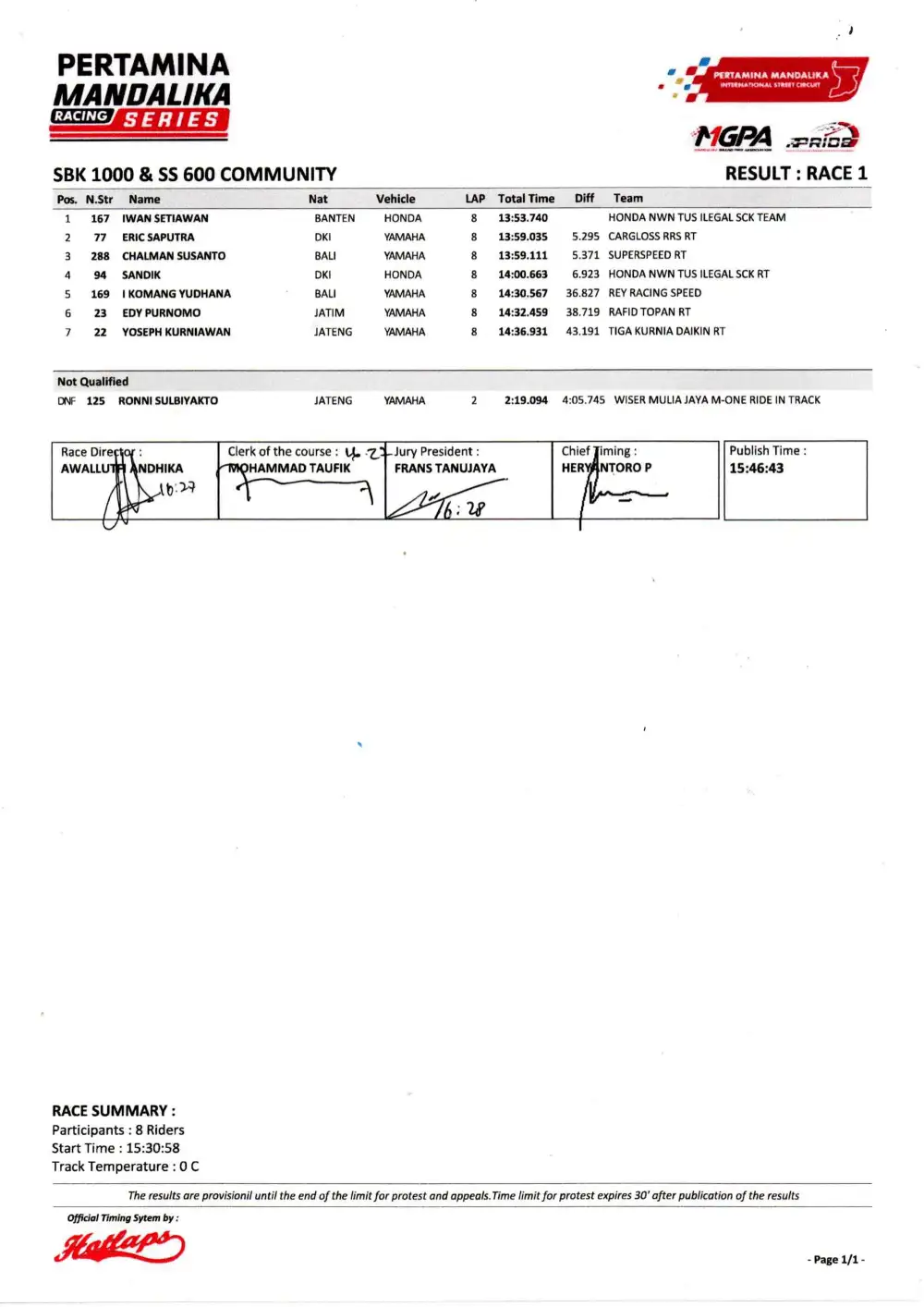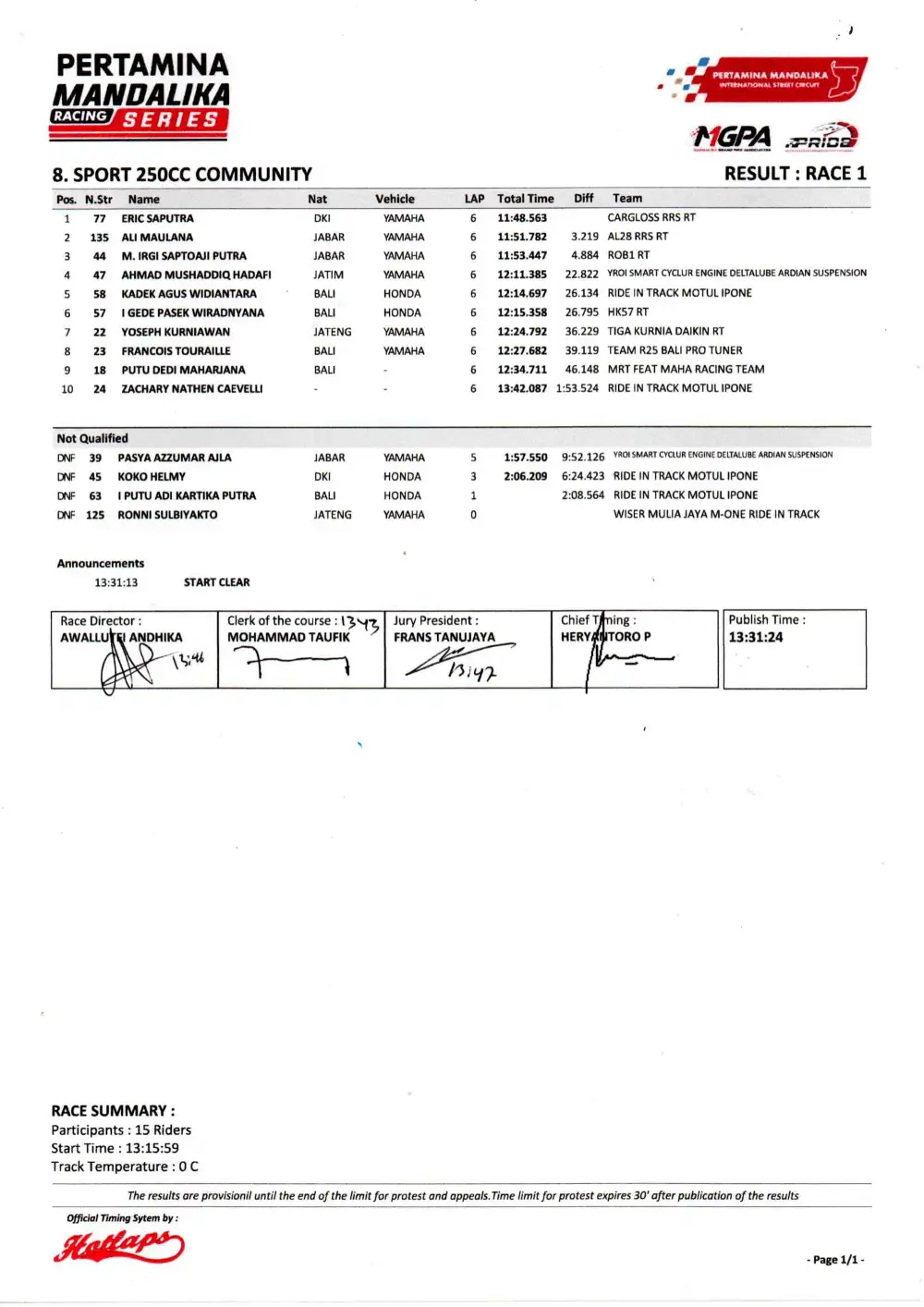 Di kelas Sport 250 Community, Eric Saputra tampil dominan sejak kualifikasi hingga garis finis. Meski sempat mendapat tekanan dari pembalap lain, ia berhasil mempertahankan posisi dan meraih podium tertinggi.