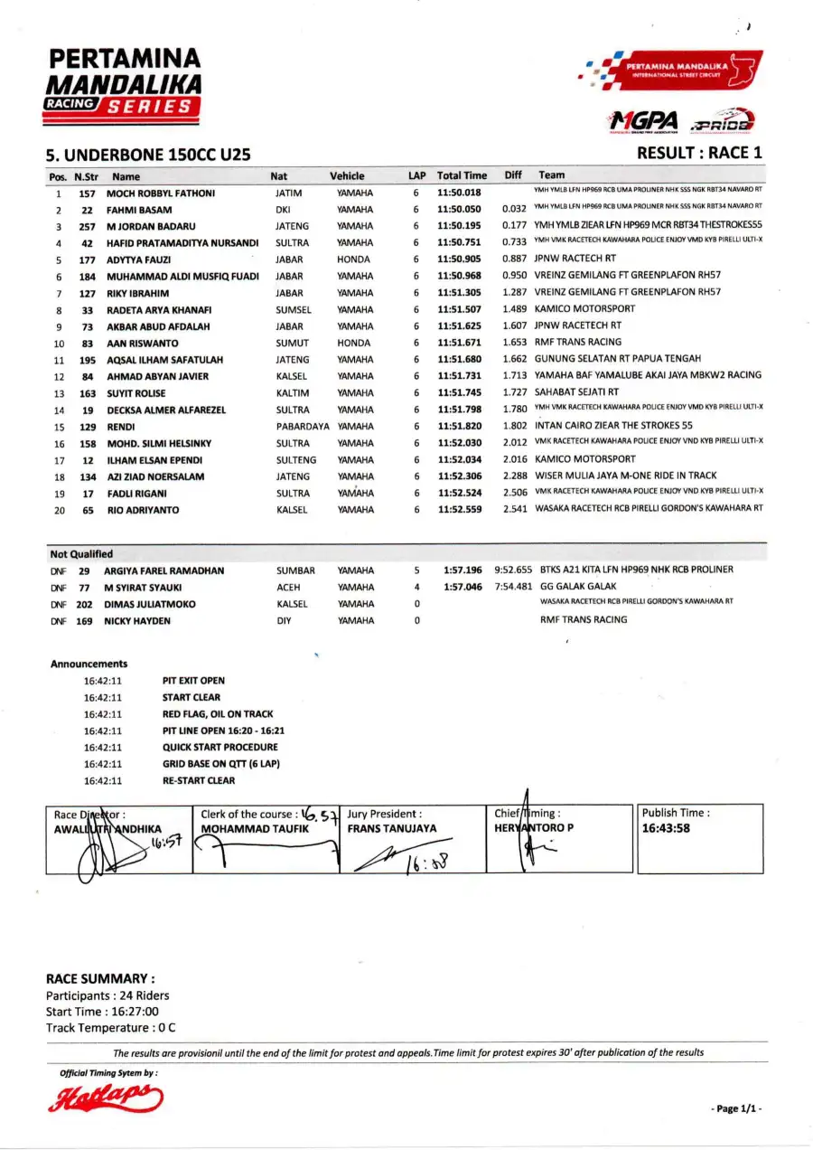 Sementara itu, di kelas Underbone 150 U-25, Murobbil Vitoni kembali tampil dominan dan meraih kemenangan, diikuti oleh rekan setimnya Fahmi Bassam. Balapan ini sempat dihentikan sementara karena kebocoran oli di lintasan, namun kembali dilanjutkan dan menghadirkan pertarungan sengit hingga akhir.
