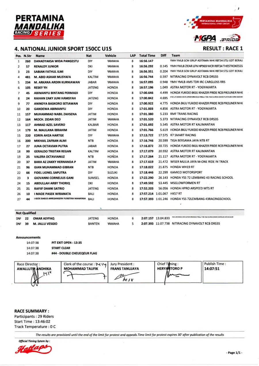 Di kelas National Junior 150 U-15, Danadyaksa menunjukkan kelasnya dan keluar sebagai pemenang race 1, disusul Renaldy Junior yang tampil konsisten dan finis di posisi kedua, mengungguli Sabian Fathul Ilmi yang harus puas di podium ketiga. Walaupun beberapa pembalap mulai tertinggal secara klasemen, perburuan tiket ke Italia masih terbuka. Masih tersisa satu balapan di hari Minggu (22/6/2025) yang menjadi penentu akhir dari perjalanan para pembalap muda ini.