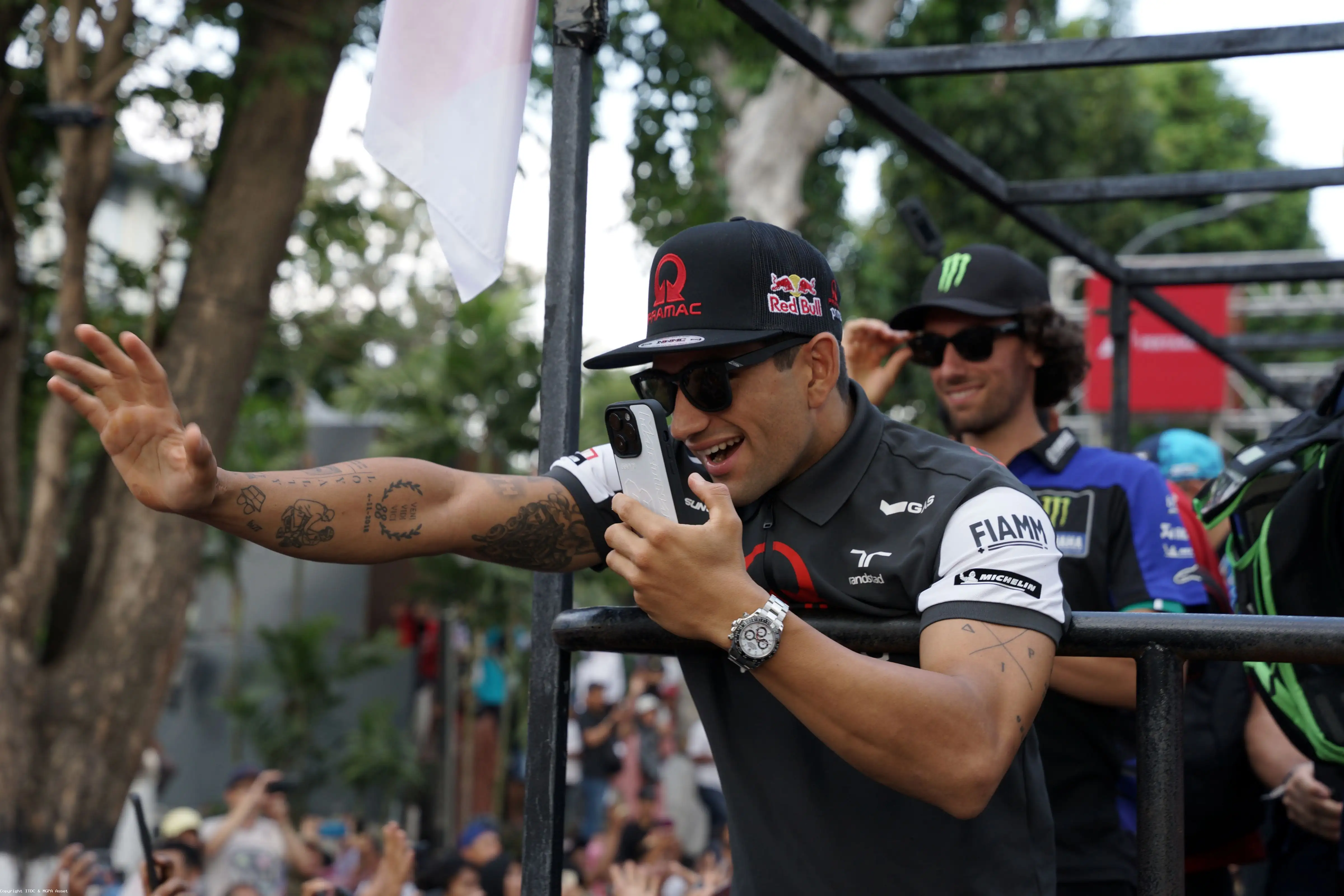 Enea Bastianini mengabadikan momen-momen indah saat sesi Riders Parade MotoGP di Kota Mataram, Nusa Tenggara Barat (25/9/2024). Aksi spontan ini memberikan dampak luar biasa untuk mendongkrak country branding Indonesia di mata internasional.