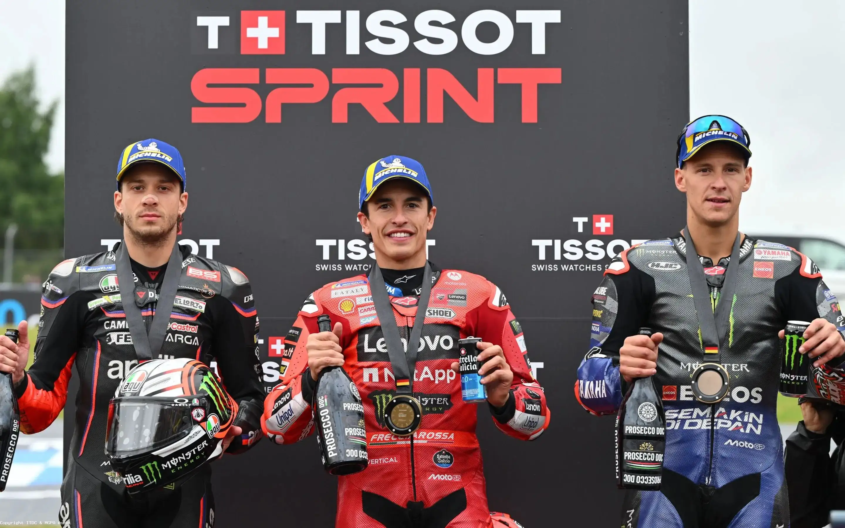 Bezzecchi berusaha memberi perlawanan, namun Marquez tampil terlalu tangguh di lintasan basah Sachsenring. Ia akhirnya mengunci kemenangan di Tissot Sprint, disusul Bezzecchi di posisi kedua dan Quartararo di posisi ketiga. Jack Miller (Prima Pramac Yamaha MotoGP) menyelesaikan balapan di urutan kelima, di belakang Di Giannantonio yang finis keempat. Brad Binder (Red Bull KTM Factory Racing) mengisi posisi keenam.