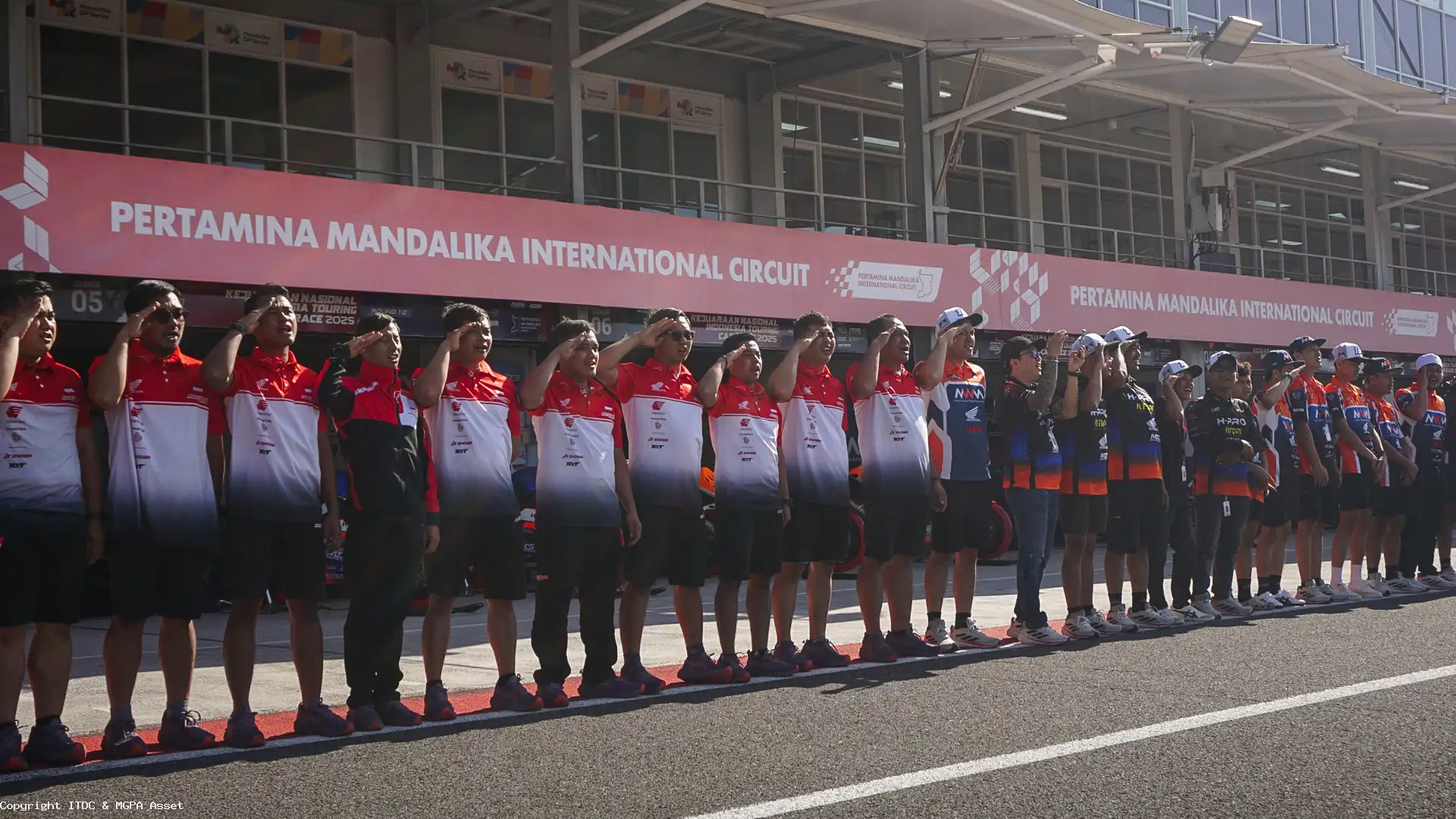 Pada pukul 09.00 WITA, seluruh pembalap, kru balap, panitia, marshal, hingga penonton yang hadir dalam ajang Pertamina Mandalika Racing Series 2025 putaran ketiga serentak berdiri, menyanyikan lagu kebangsaan Indonesia Raya dan mengheningkan cipta untuk mengenang jasa para pahlawan bangsa.