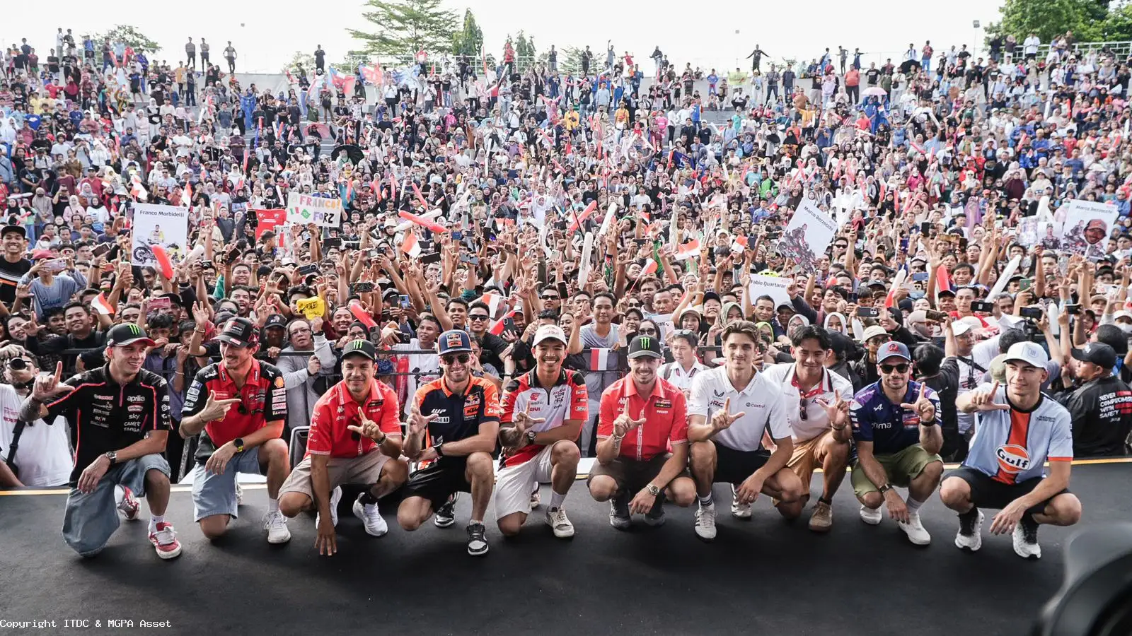 Nama-nama besar yang ikut serta dalam parade ini antara lain Marco Bezzecchi, Francesco Bagnaia, Franco Morbidelli, Fabio Di Giannantonio, Luca Marini, Brad Binder, Miguel Oliveira, Raul Fernandez, dan Somkiat Chantra, serta pembalap kebanggaan Indonesia di kelas Moto2, Mario Aji. Kehadiran Mario Aji menjadi sorotan istimewa, karena mendapat sambutan meriah dari para penggemar tanah air yang bangga melihat putra bangsa tampil bersama bintang MotoGP dunia.