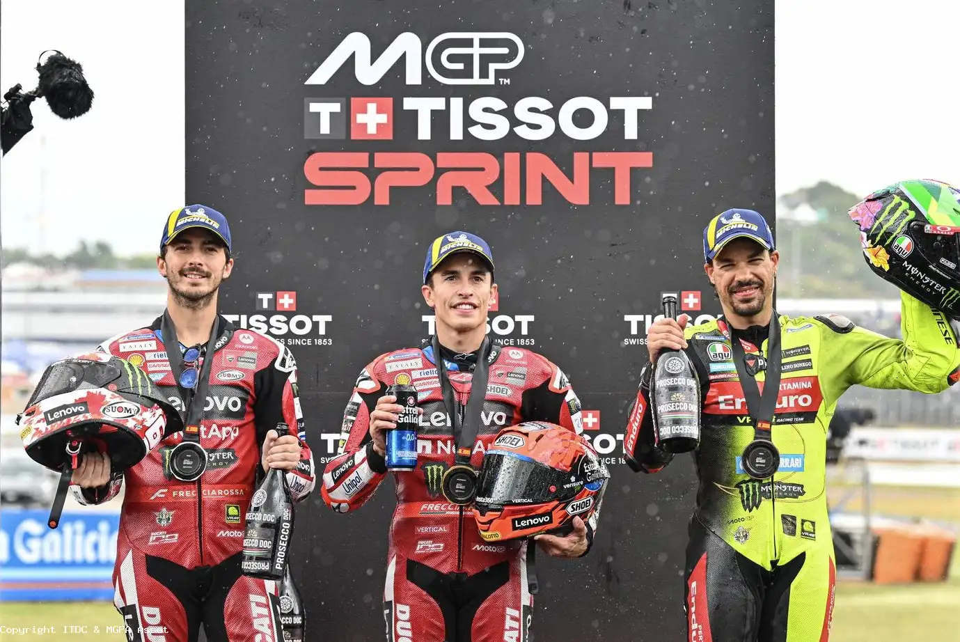 Namun, keunggulan Bagnaia tidak berlangsung lama. Dengan kepercayaan diri tinggi dan kecepatan yang konsisten di lintasan basah, Marc Marquez berhasil mengejar dan menyalip rekan setimnya tersebut pada tiga lap terakhir. Ia kemudian mempertahankan posisi hingga garis finis, mengunci kemenangan dramatis di hadapan publik Jerez.